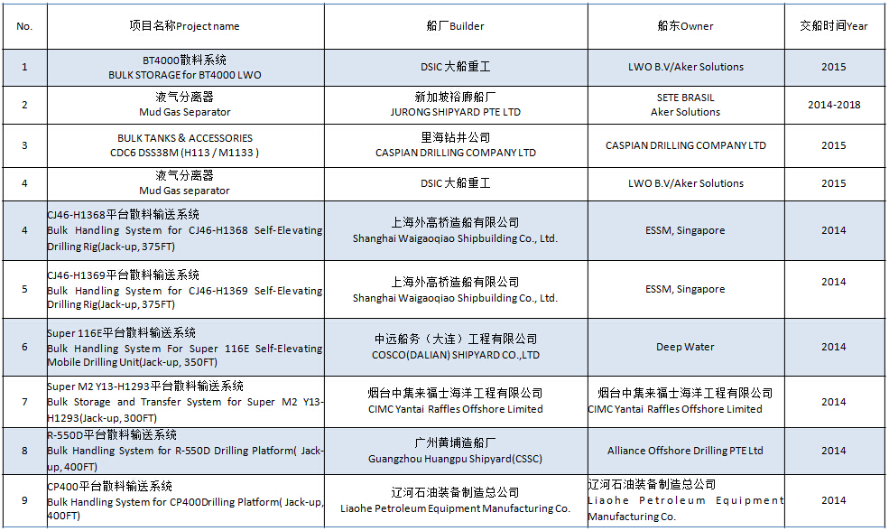 散料輸灰系統(tǒng)業(yè)績(海洋平臺(tái)) 液氣分離器客戶案例:新加坡裕廊船廠 TSC Super M2 H209自升式鉆井平臺(tái)散料輸送系統(tǒng)客戶案例:煙臺(tái)中集來福士海洋工程有限公司